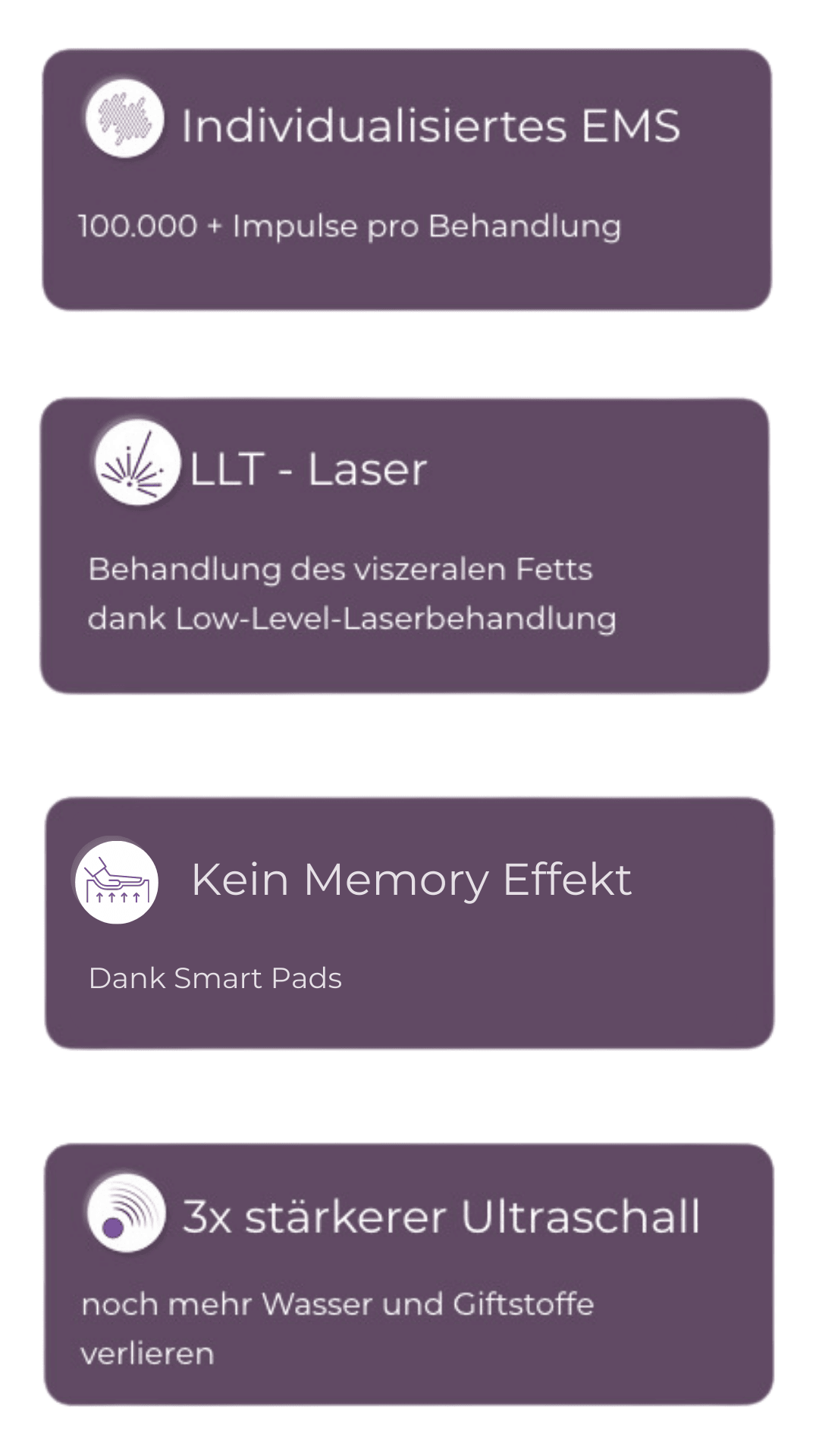 Mit unserem bewährten Erfolgskonzept erreichst du in nur 5 Schritten deine Traumfigur. Alles, was du tun musst, ist dich auf eine unserer bequemen Liegen zu legen. Anschließend bringen wir die Platten gezielt an deinem Körper an. Die Behandlung ist absolut schmerzfrei, und du kannst dich dabei vollkommen entspannen. Währenddessen werden in deinem Körper die natürlichen Prozesse aktiviert, die das Abnehmen unterstützen: